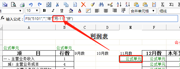 5、修改报表取值公式,12月金额列公式为FS("5001","","年","月","贷"),则11月金额列为FS("5001","","年","月-1","贷")、10月金额列为FS("5001","","年","月-2","贷"),9月金额列为FS("5001","","年","月-3","贷"),以此类推到1月金额列为FS("5001","","年","月-11","贷"),其他取值科目修改公式中科目编码且同样定义该公式,具体操作如下,复制12月数的公式单元,然后粘贴到11月数的单元格,在公式处把“月’改成“月-11”,然后保存。
