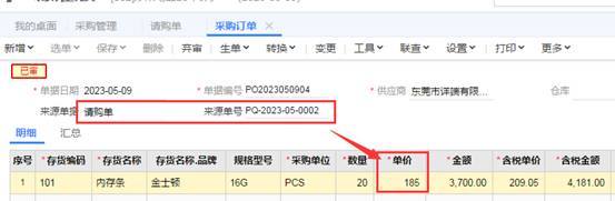 3、设置完成后,再来录入请购单并生成采购订单,这时候请购单与采购订单的单价也就一致了,如图下: