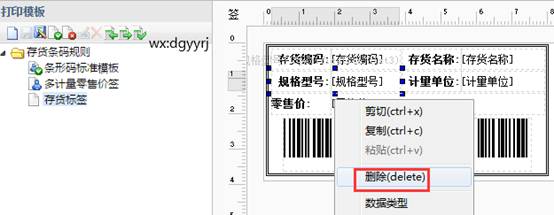 4、进入模板设计中,可以看到默认的存货标签模板中预置了几个字段,假如我们现在的要求是不打印规格型号,另外再添加一个品牌出来,点击规格型号并鼠标右键删除,如图下操作: