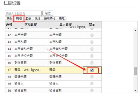 2、进入栏目设置,点击明细,找到赠品勾上并保存,如图下: