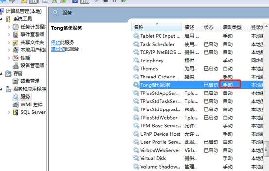 3、在右边栏找到两个服务“Tong 备份服务” 和 “用友通”,可以看到两个服务启动类型都是手动,如图下:
