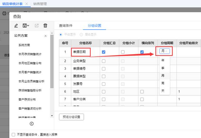 2、进入销货单统计表界面,点击“分组设置”并勾上“平级显示”如图下: