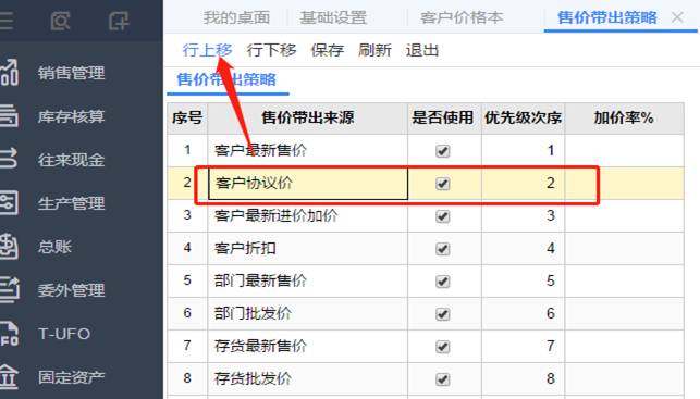 5、选中客户协议价,点击行上移,移到第一位并保存,如图下操作: