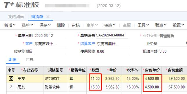 4、最后我们来填制销货单,录入不同的数量,就会带入不同的价格,如图下:
