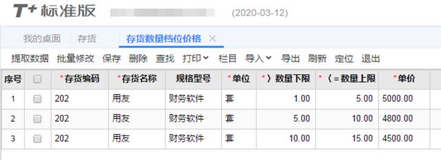 前言:阶梯价格也可叫做数量档位价格,意思就是购买数量越多,价格也就便宜,比如购买1-5套用友价格为5000,5-10套用友价格为4800,10-15套用友价格为4500,以此类推,下面就以用友T+为例来说明如何设置阶梯价格。