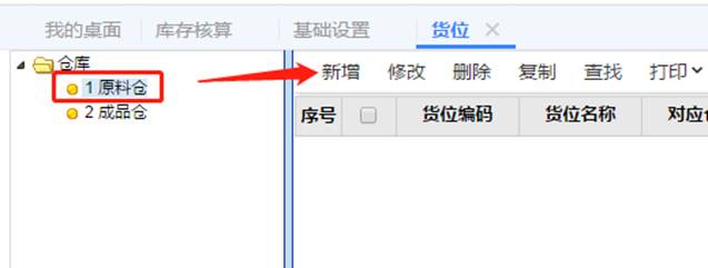 4、仓库启用货位后,就要设置仓库里有哪些货位了,以原材仓为例来增加货位,点击基础设置-货位,选中原材仓,点新增,如图下操作:
