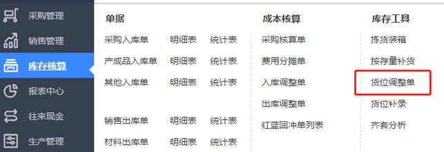 9、补充2:货位录错了,如何调整到正确的货位呢?点击库存核算-货位调整单,录入调出货位与调入货位并保存审核,如图下操作: