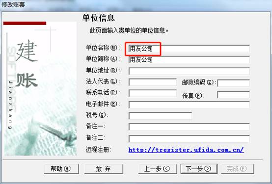 5、然后把“用友公司”改成所需要的全称“用友软件有限公司”或者改成其他公司名,再点击下一步,如图下: