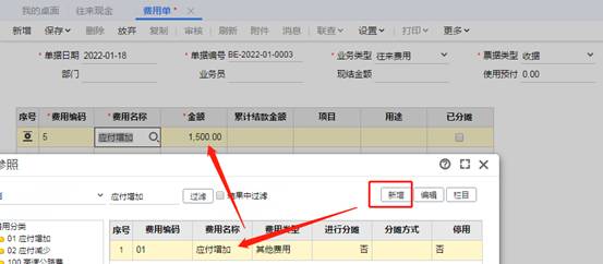 3、实际核查后应付是7500,那就补一张1500的费用单,费用名称新增为应付增加,金额录入1500保存并审核,如图下: