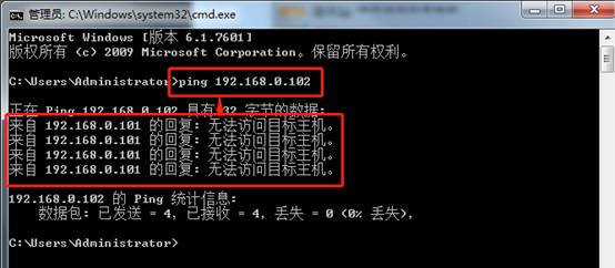 2、输入PING+IP地址并回车,当出现无法访问目标主机时,那就说明客户端电脑与服务器之间网络不通,此时就要去排查网线与路由器了